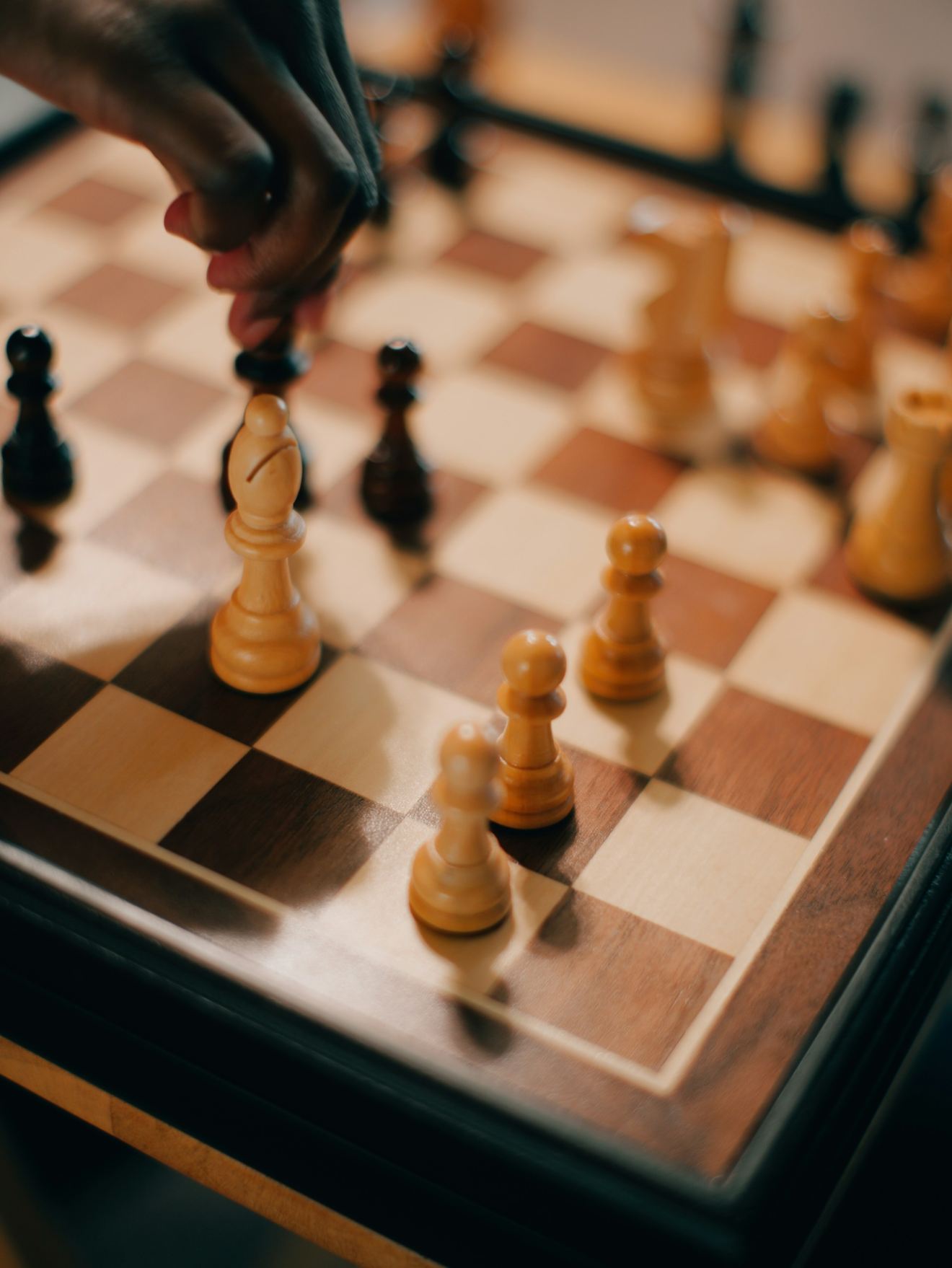 2. Visual Contrast. Light and dark squares should be distinguishable and use a complementary color palette (meaning no analogous color palette, e.g., beige + brown combination), and the pieces should also stand out; you must be able to identify each piece from every perspective.