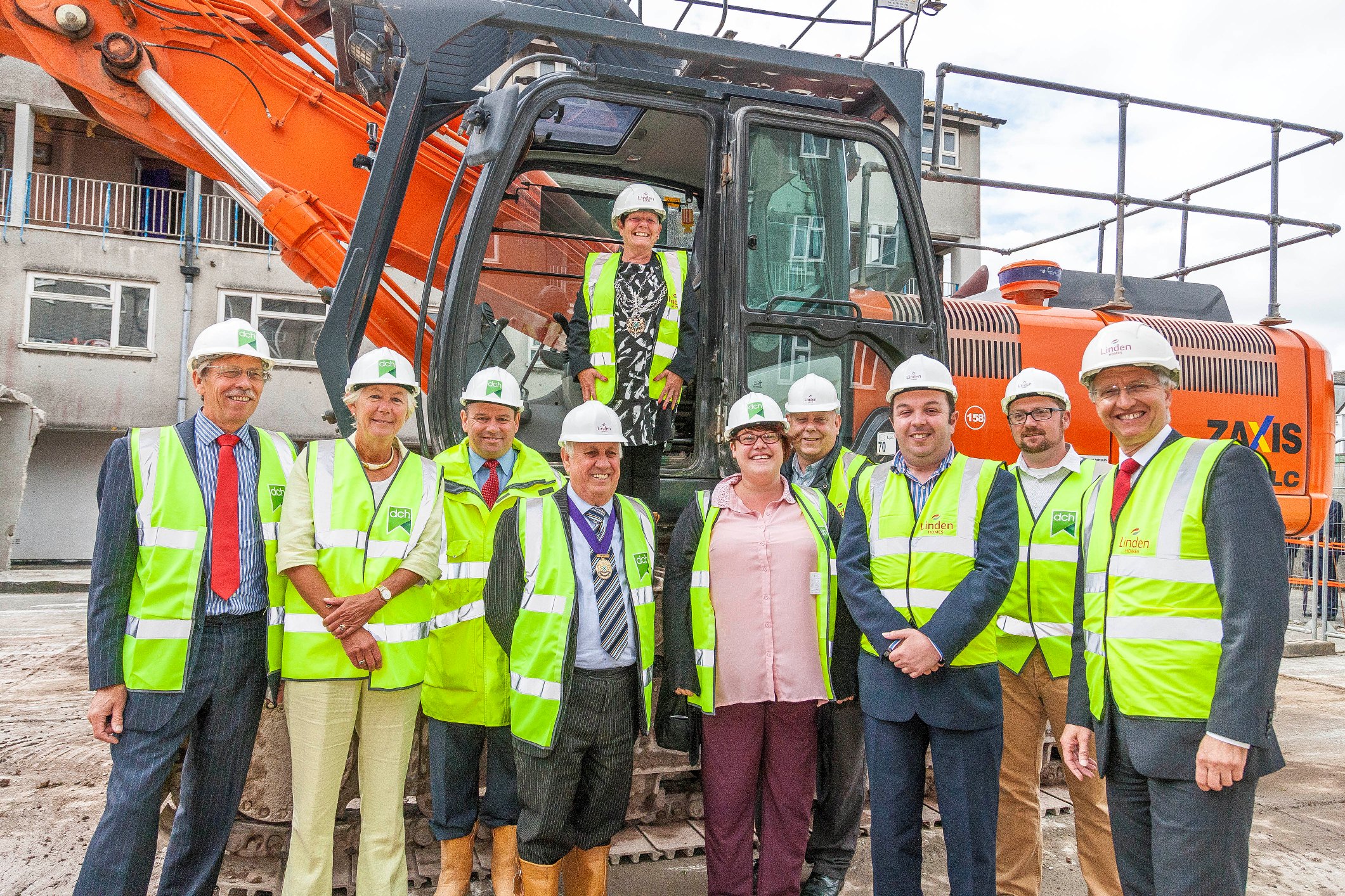 Councillors and representatives from Linden Homes and DCH came together for a photo at the demolition event which marks the start of work on ‘Emerge’, a new housing development being created by Linden Homes and DCH.