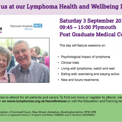 People affected by lymphatic cancer in the Plymouth area are encouraged to attend a free wellbeing event next month to learn more about living with and beyond lymphoma, the UK’s fifth most common cancer.